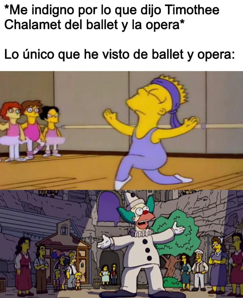 Vaya madriza que la gente del internet le está acomodando al Jitomate Saladet, después de que el wey habló de más en un podcast con Matthew McConaughey para Variety. Timotheé Chalamet básicamente dijo que no habría manera humana de que trabajara en el mundo del ballet y la ópera pues es un mundo que ya a “nadie le importa”. Santi, que ha vivido el martirio de levantarse un sábado temprano para ir al festival de ballet de su hermanita, coincide completamente con la apreciación del Marty Supreme, pero al parecer estas palabras hirieron muchísimo la susceptibilidad del mundo del ballet y la ópera, que ya lo están funando en do sostenido. El New York City Ballet, la Met Opera, el Royal Ballet, la Opera de Roma y básicamente todas las compañías que ves en la Scalla de Milán cuando necesitas una Power Nap en medio del eurotrip salieron a insultar de arriba a abajo al buen Timoteo, que al parecer ya es el Karlo Sofio Gascón de los Oscares para este año.