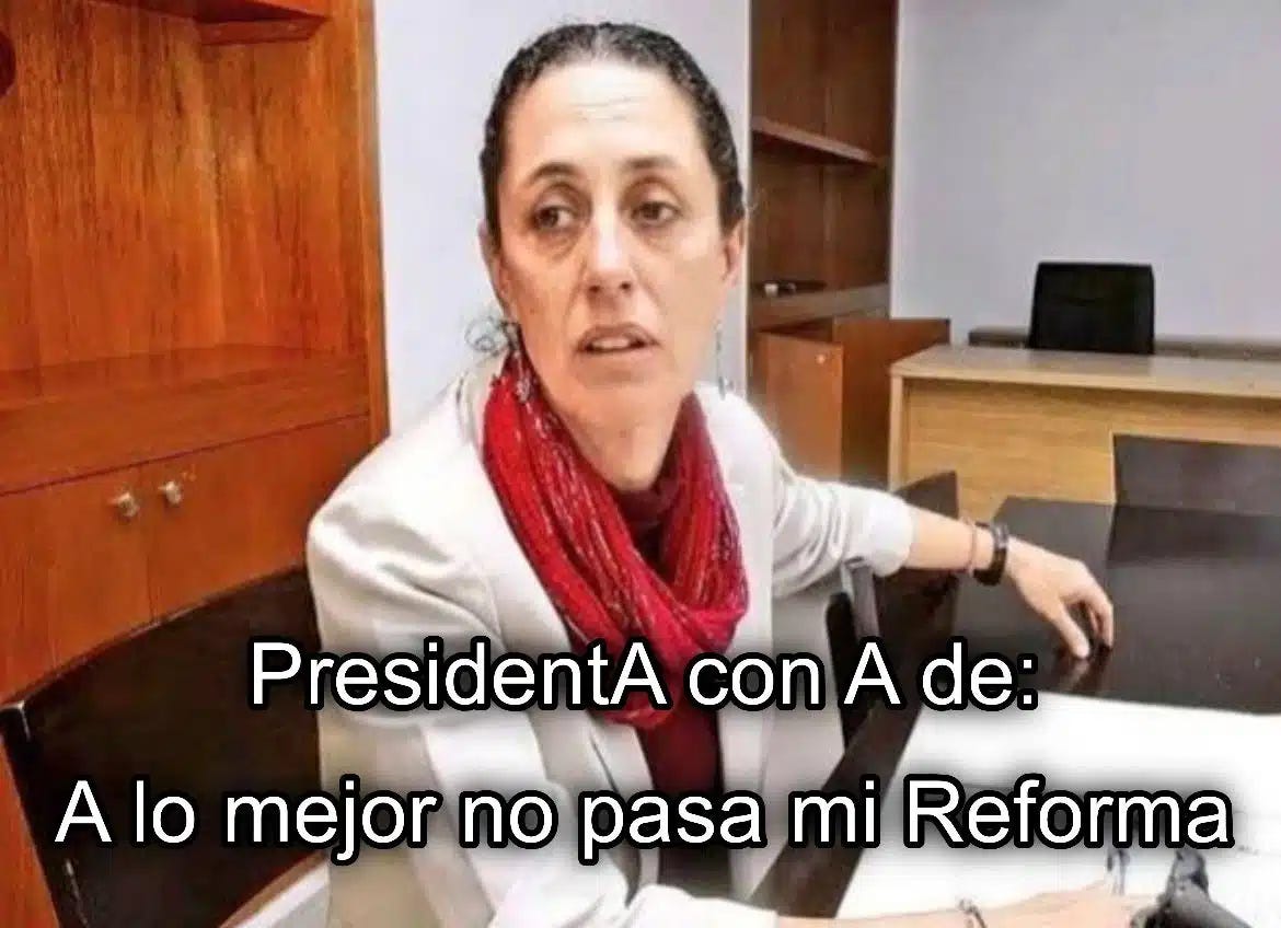 Aunque La Doctora ni siquiera había mandado su reforma electoral al Congreso, parece que ya vio que la situación va a estar dura sin aliados que la respalden. Por esto, en su ShameShow dejó claro que, si no consigue el apoyo y no pasa la bendita reforma, tiene un Plan B bajo la manga (qué no esto ya era el Plan C?). La neta ya perdimos la cuenta de cuántos planes de reformas terribles han presentado los gobiernos de Morena. Shame mantuvo su plan B del plan Z en secreto y dijo lo de siempre: que no hay que adelantarse y que ella ya cumplió con lo que