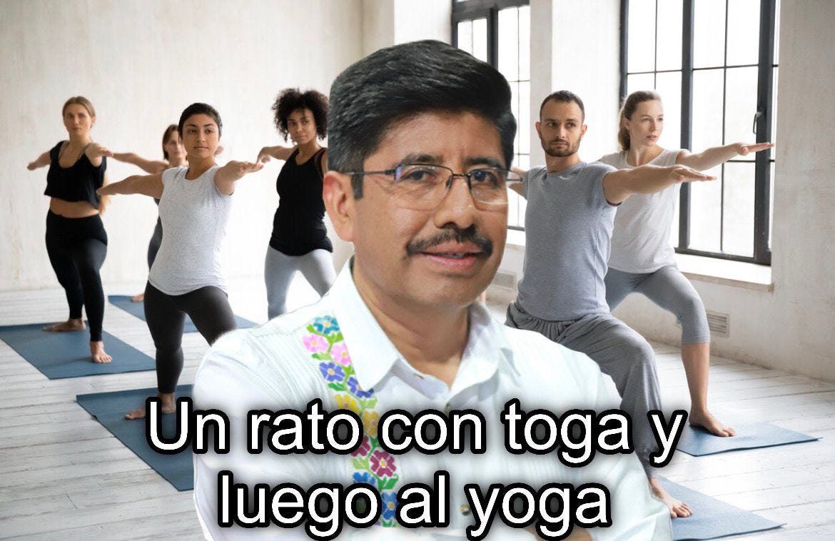 Namastetl. Para la SCJN, la justicia no solamente debe ser ciega, también debe ser flexible y, sobre todo, saber cocinar. El máximo tribunal del país entregó contratos fast-track para que los queridos Ministros del Bienestar puedan tener clases de yoga, tai chi y cocina. Todo pagado con fondos públicos, obvio. Esto se dio a conocer horas después de que la Becaria de Palacio dedicara parte importante de su ShameShow a defender a Hugolopochtli y sus Amigos, asegurando que los neoliberales de la Corte anterior se gastaban más dinero (más que las Cherokees, los cuadros y el bikram yoga). Aparte de tener que borrarnos la imagen de Doña Batres en leggins de la cabeza, les tenemos un mensaje: ustedes promovieron que el pueblo los escogiera por honestos y austeros, ahora no se quejen si el pueblo les cuenta cada centavo que gastan. Más detalles (y memes) aquí