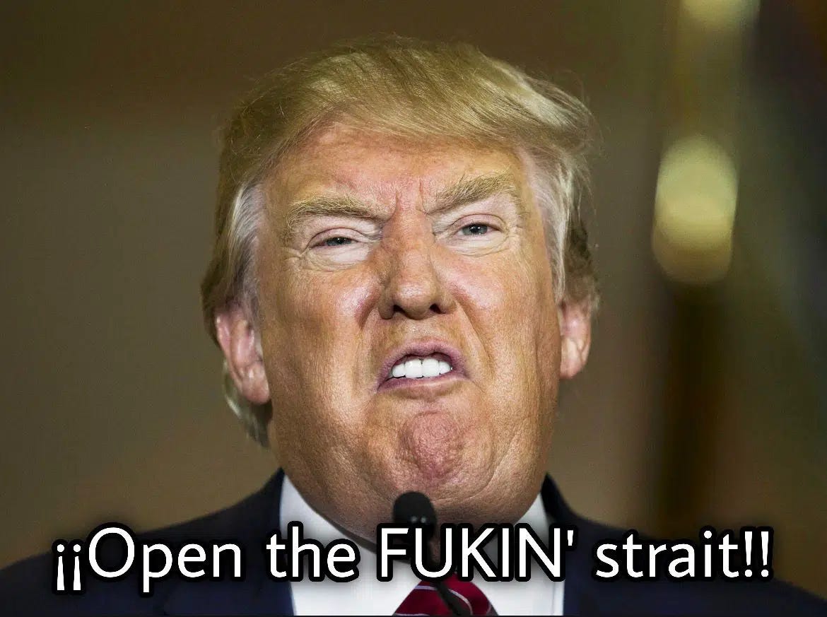 Con la tremenda ghosteada que le andan pegando los Iranians, la Papaya Maradol Republicana perdió el cool y les exigió en tuiterantesequis que “Open The fuckn strait, you bstards”. Y no es para menos, como el (G)ayatollah sigue abriendole el Estrecho (de Ormuz) solo a sus (buques) amigos, la economía de Estados Unidos está a nada de venirse abajo… pues por ahí pasa el 25% del petroleo global. Según Trump, Teherán tiene hasta el martes para abrir por completo el estrecho si no quieren enfrentarse a la furia gigantesca de Estados Unidos, que los harán vivir “un infierno”. El tema es que los Ayatollahs ya tienen medido el famoso Trump Always Chickens Out (TACO), pues el wey lleva con este cuento semanas y nomás no hace nada.