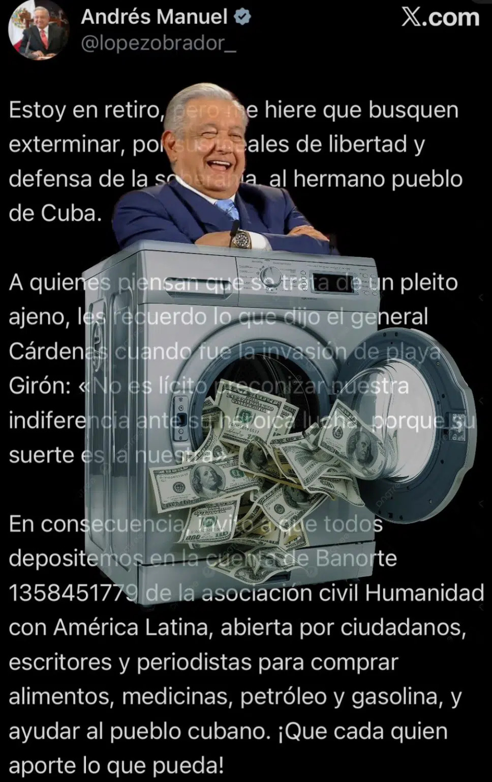 Se acuerdan que el Macuspano juró y perjuró que al acabarse su sexenio iba a desaparecer de la política y la vida pública? Bueno, pues fast forward 18 meses y el carnal ya sale hasta en la pinche sopa. En un acto bastante claro de pasarse a Claudia por el Arco del Triunfo, salió del “retiro” una vez más. Para pedir perdón por los 200,000 homicidios durante su sexenio? O para explicar de dónde sacan varo sus hijos? O tal vez para explicar porqué su “hermano” es parte del Cartel de la Barredora? Not really… más bien fue para pedir dinero (neta). El Macuspasno dijo que le “hiere” que intenten “exterminar” a sus hermanos cubanos y ahora anda pidiendo dinero para