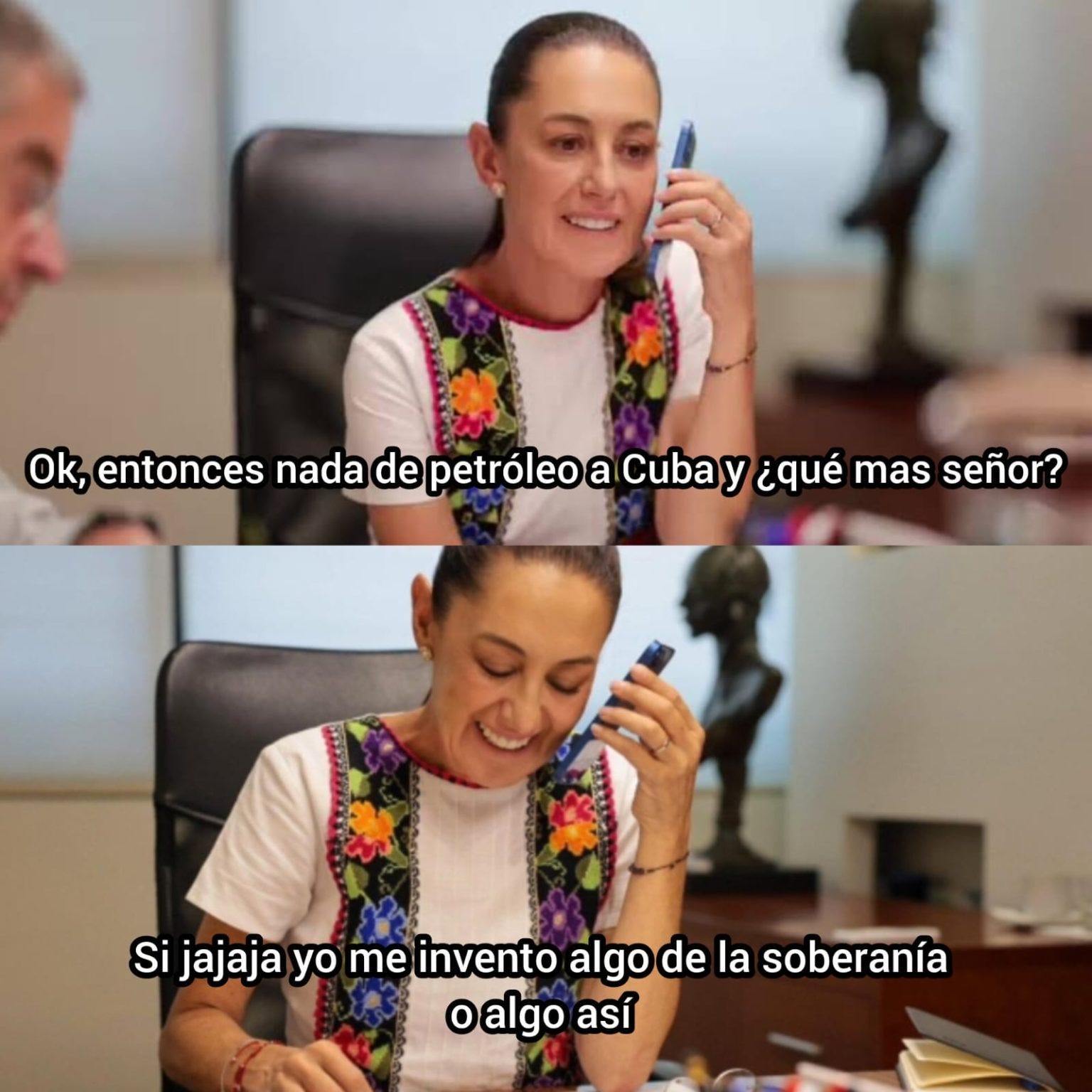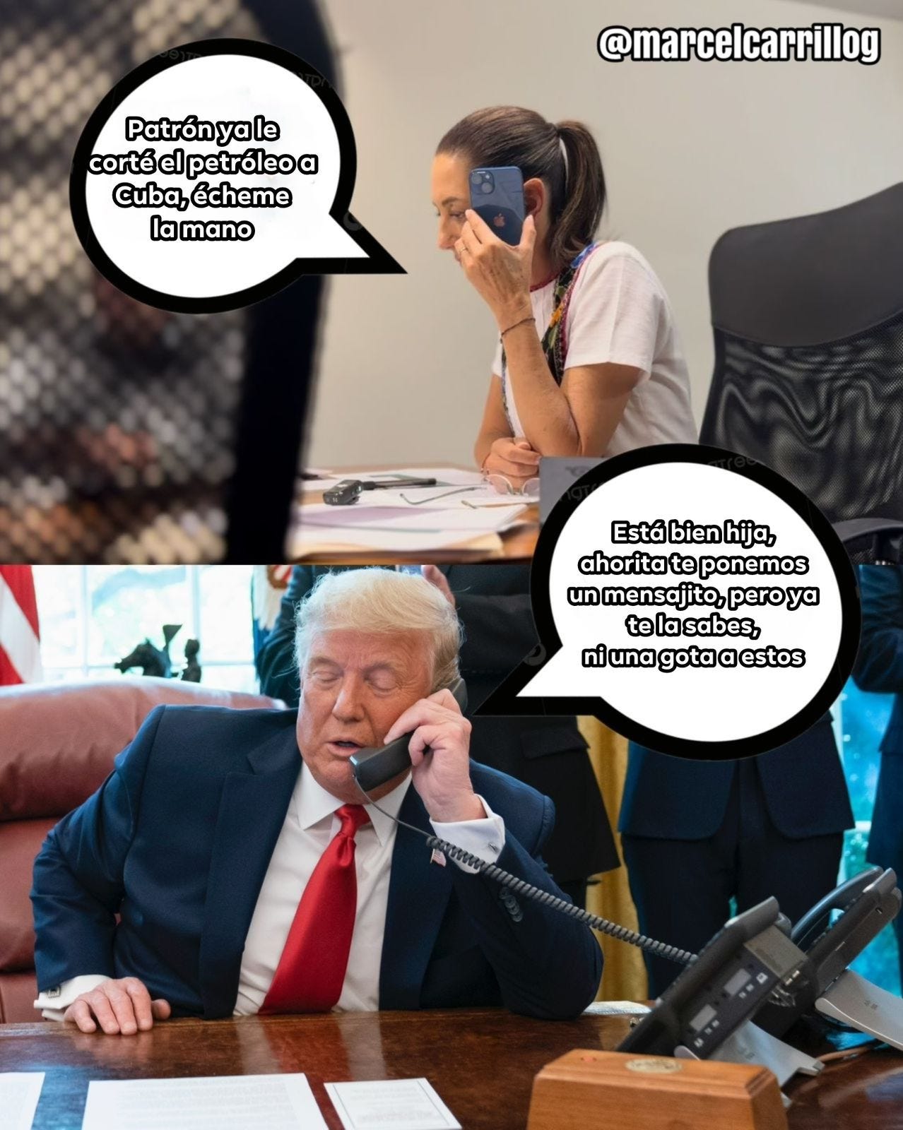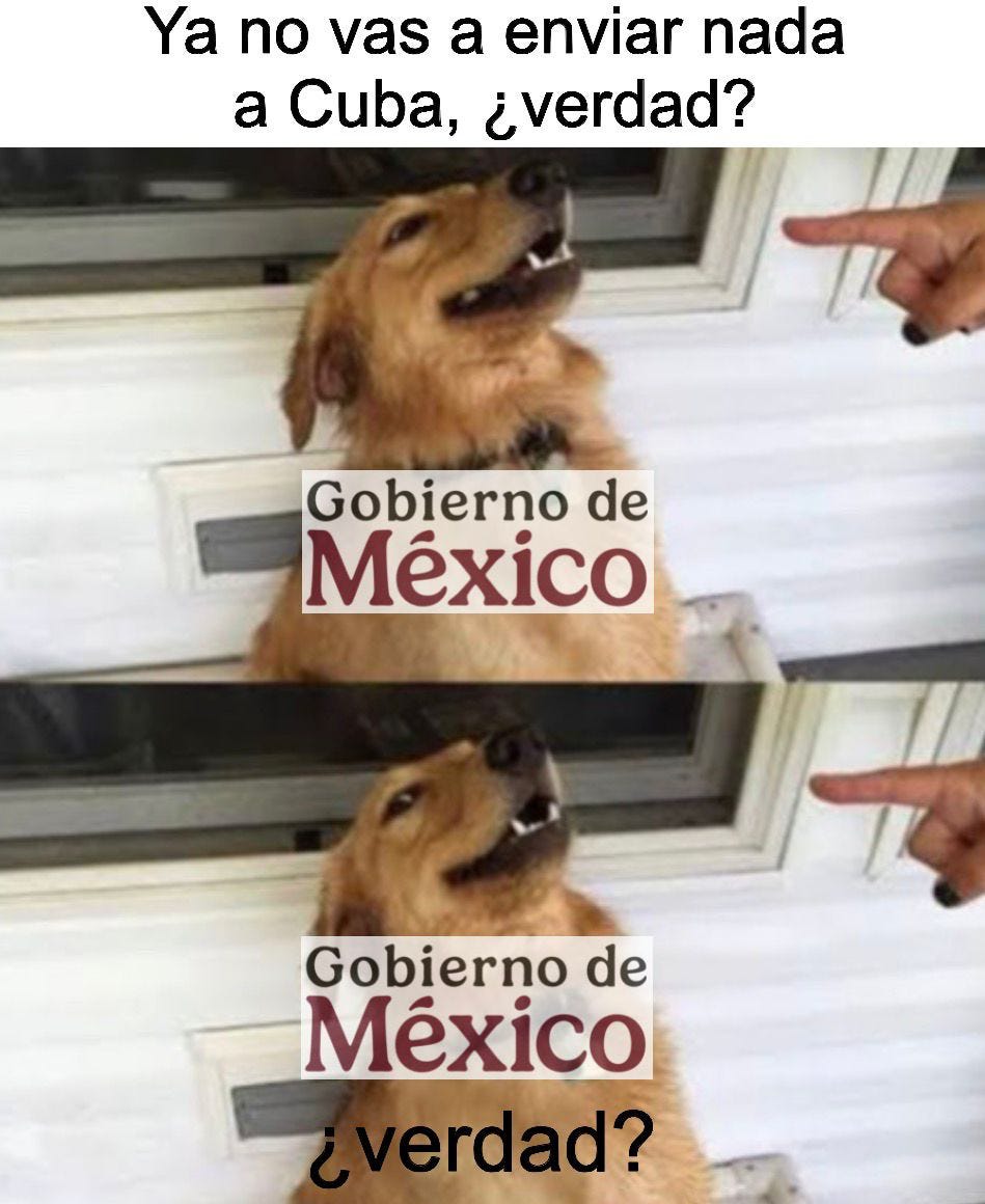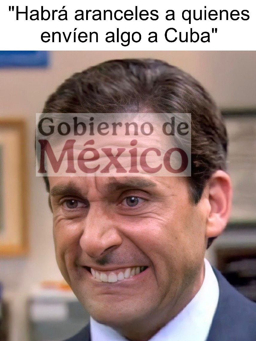 Salero del Bienestar. La neta ya hasta nos sentimos mal por nuestra Presi. El running joke en esta H Redacción es que siempre que la Doctora habla con Trump, sale a su Venga La Mañanera a celebrar su exito nivel Winstona Churchill y un día después el Naranjón la deja como payaso internacional. Pero ahora sí se mamó el Lórax… apenas unas horas después de decir que era la mujer más inteligente del mundo, el Señor Toupé soltó la declaración con la que mi Clau lleva teniendo pesadillas semanas: todos los países que le manden petróleo a los cubanitos serán víctimas del rasho arancelizador del Trún. Tal vez es buen momento para dejar de ser tan humanistas con ellos, no? (link: Salero del Bienestar)